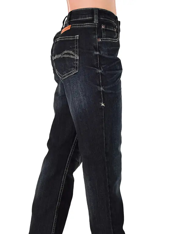 Just like steel, these jeans are built TUFF! Made durable without compromising comfort, so it'll will keep up with your cool dude all day. The specialty wash makes each jean slightly different. Washed out barbed wire on the back pockets with top stitch in black color. Thick steel colored stitching throughout.