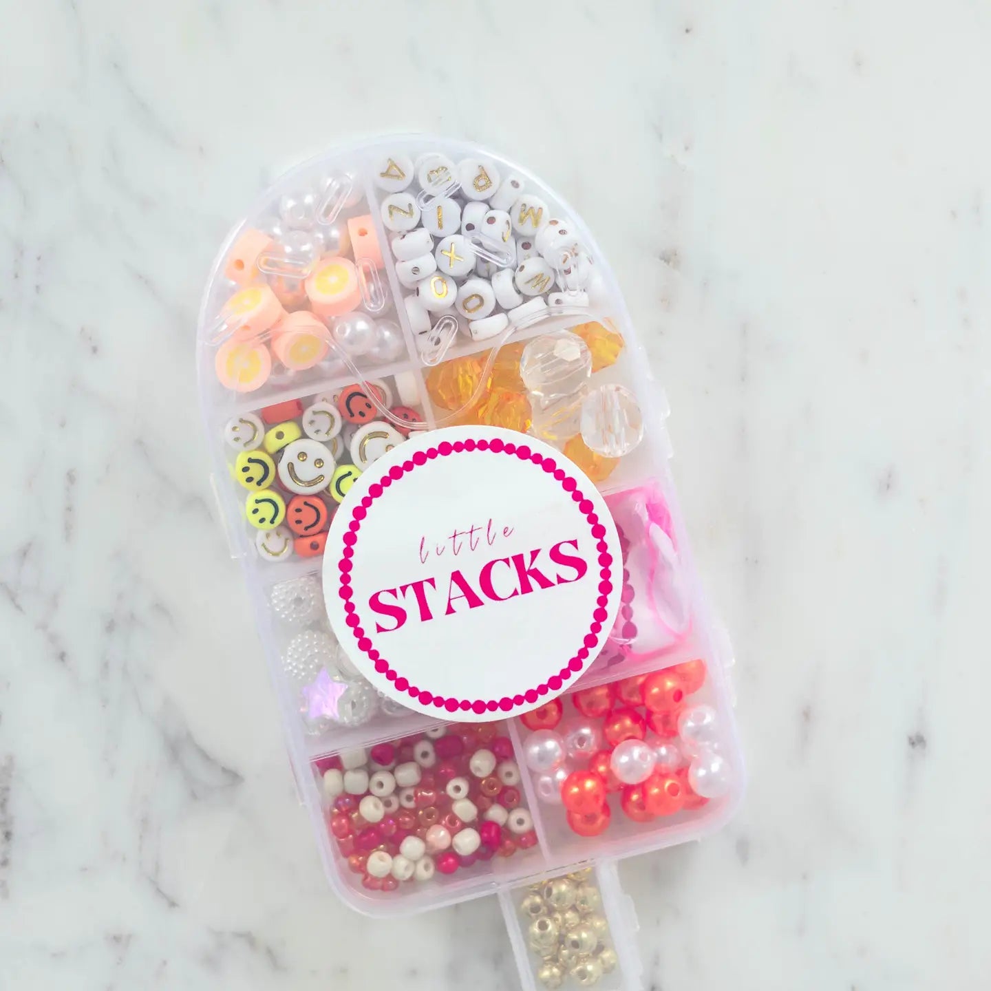 If you chose Orange Creamsicle as your popsicle flavor, then you will get a citrus explosion! This kit features orange fruit polymer clay beads, gold and white happy faces, orange and white pearls, gold and white alphabet bead letters, and various other beads to add a little creamy POP to your little STACK.